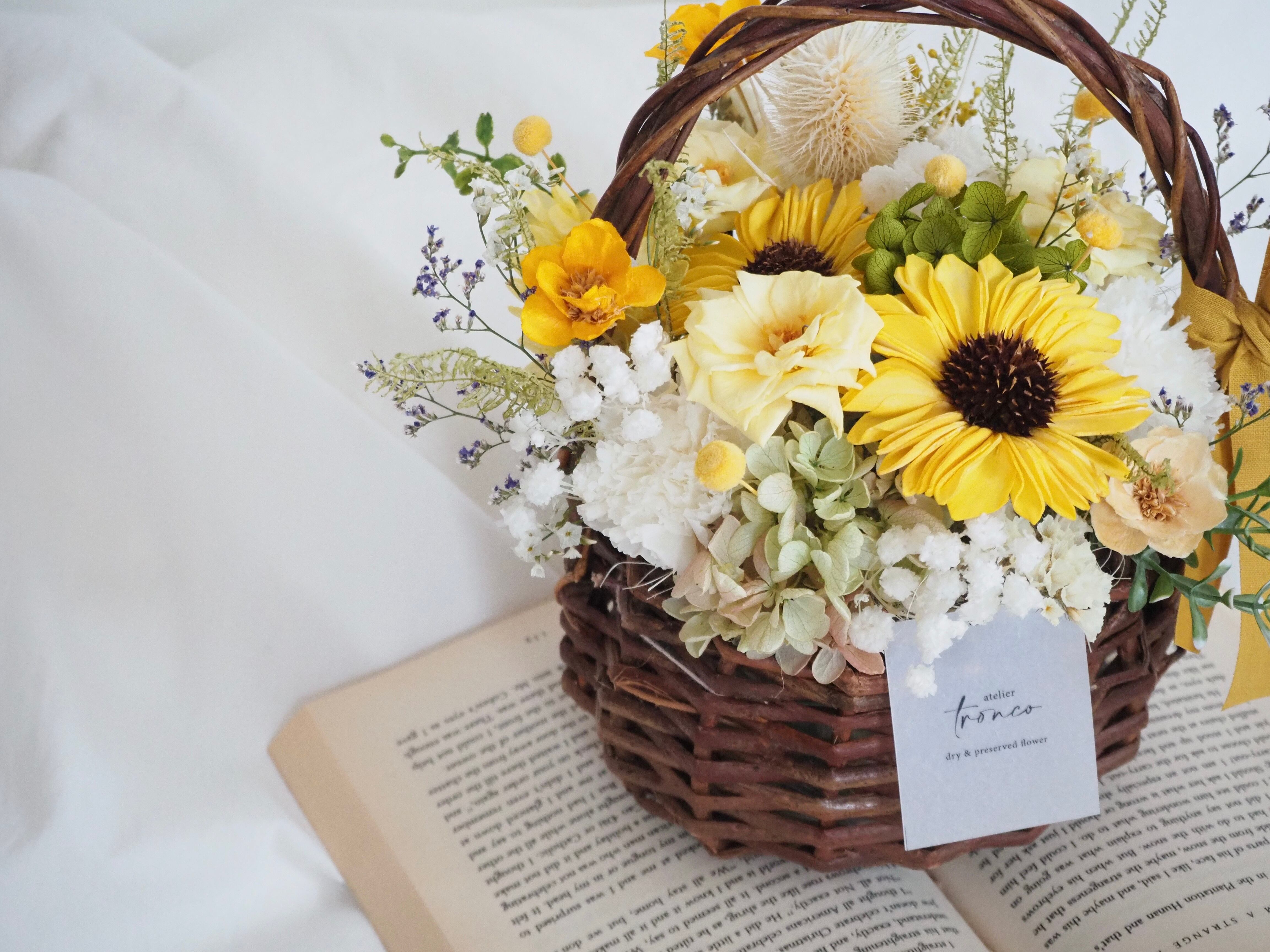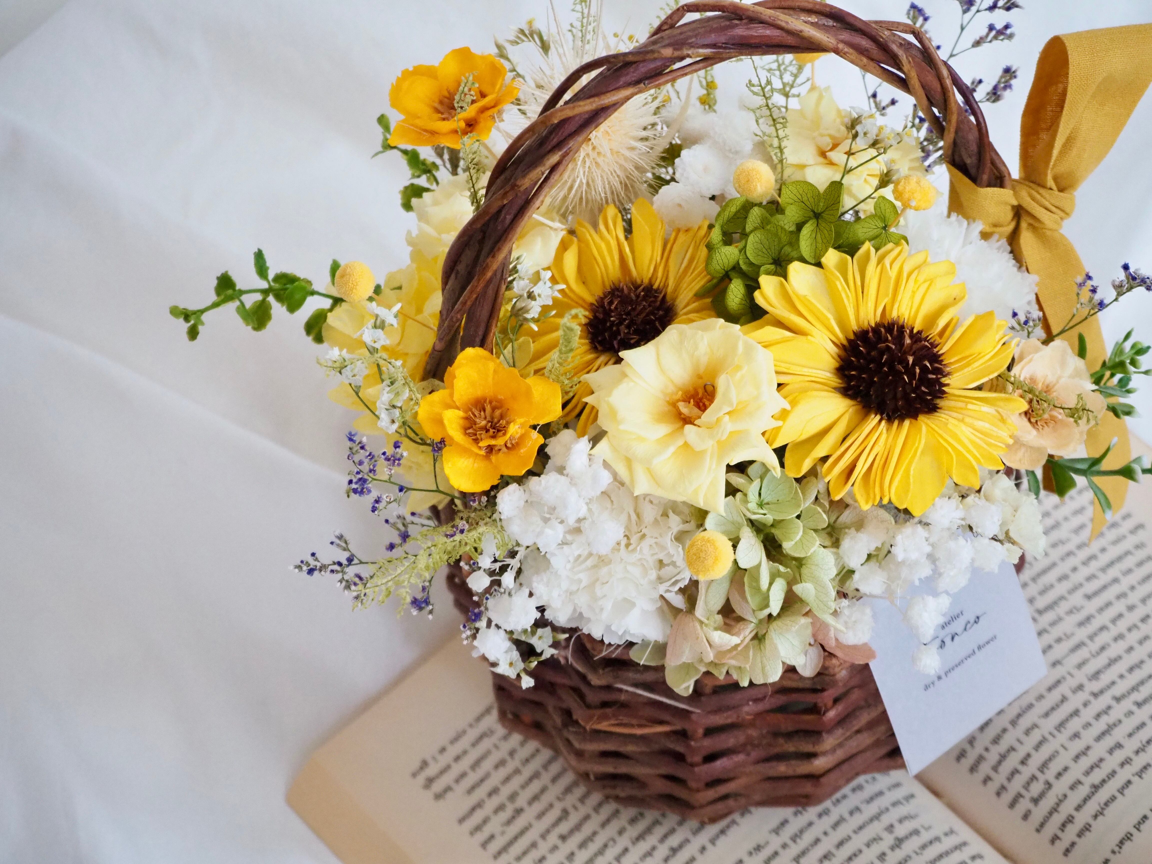 プリザーブドフラワー ドライフラワー アートフラワー 花 花束 アレンジメント バスケット カゴ プロポーズ 誕生日プレゼント 結婚祝い 記念日 退職祝い 開店祝い 両親贈呈品 インテリア ギフト ブライダル バラ 清楚 上品 大人可愛い 花かご ヒマワリ